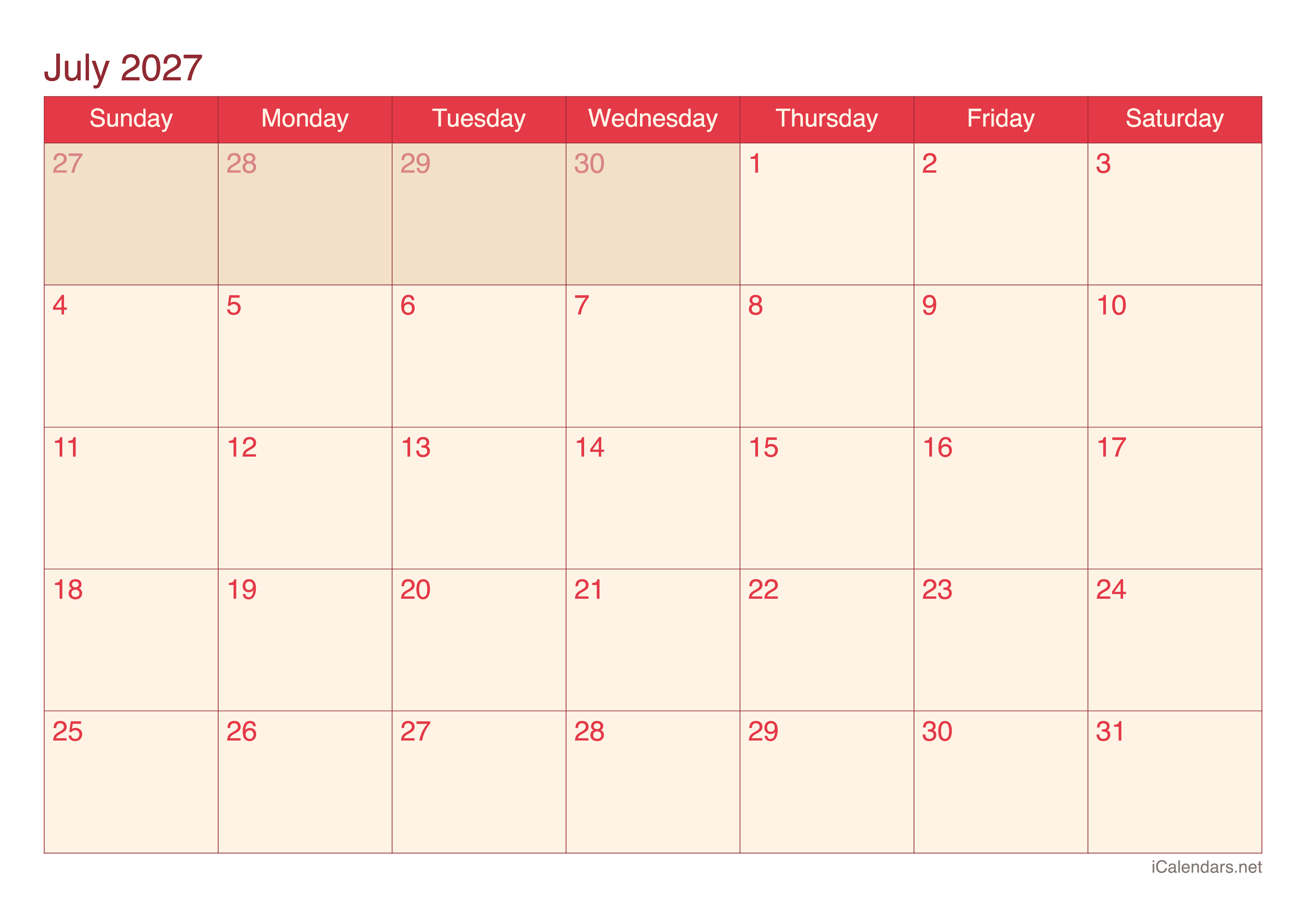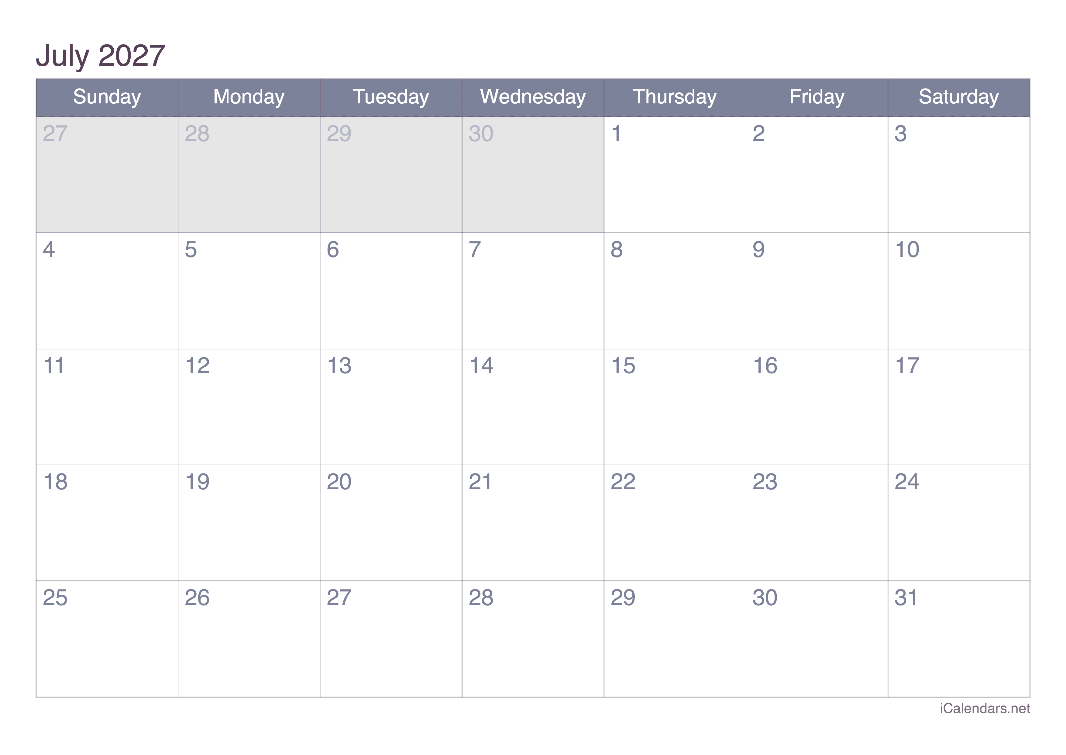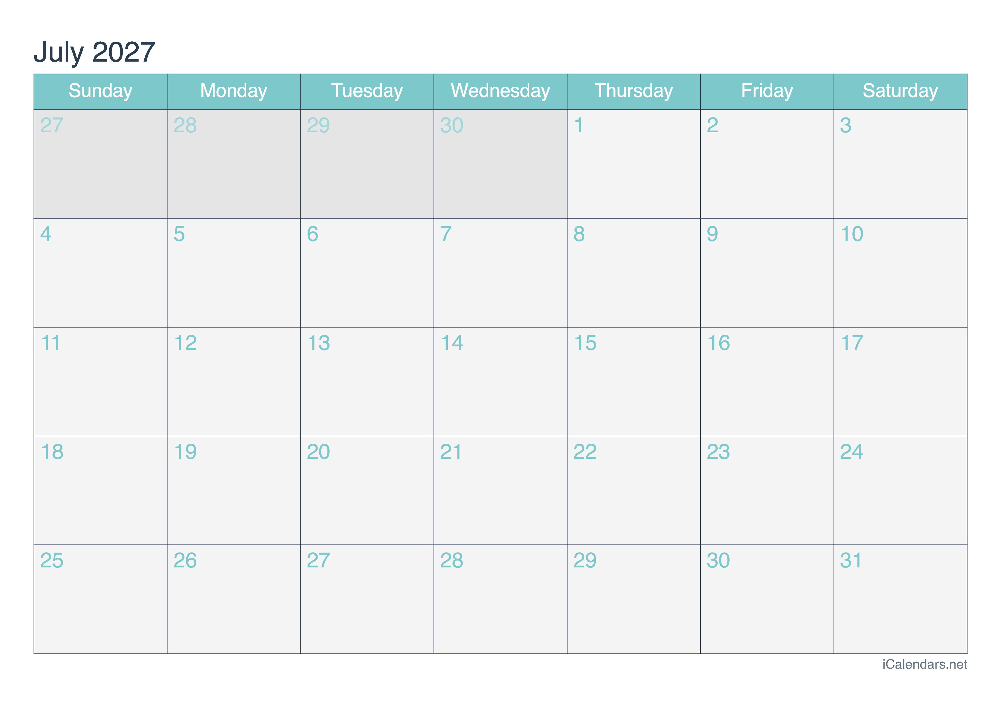 You can download and print this calendar of July 2027, available in image, PDF and Excel format. You can choose one of the 4 color themes.