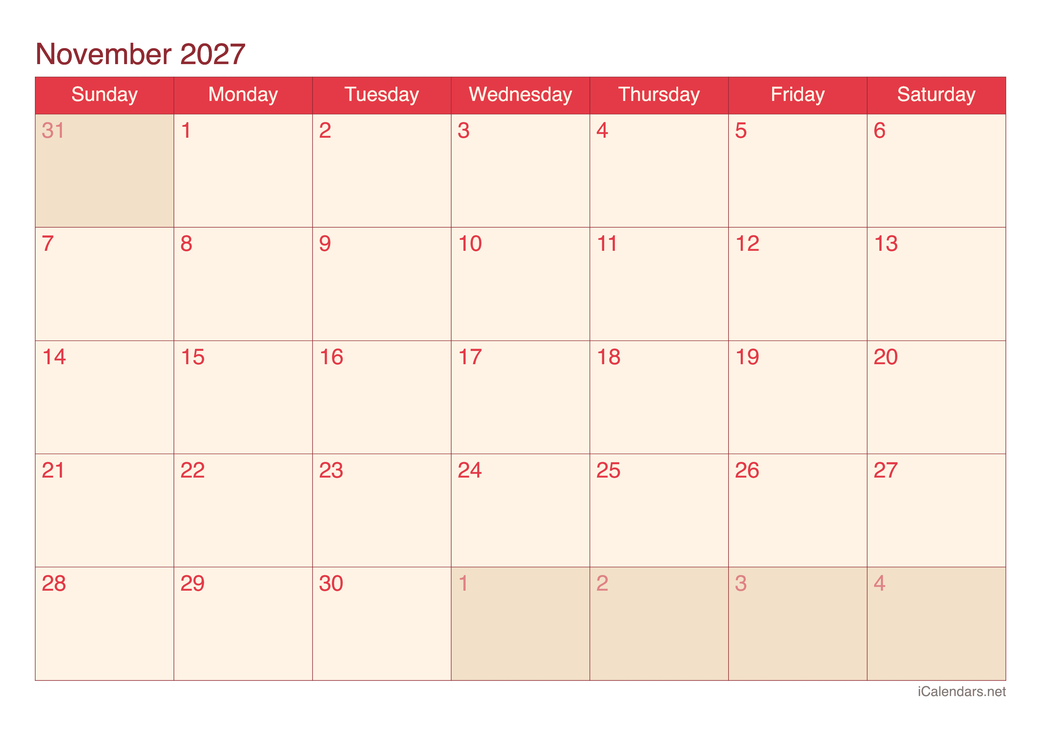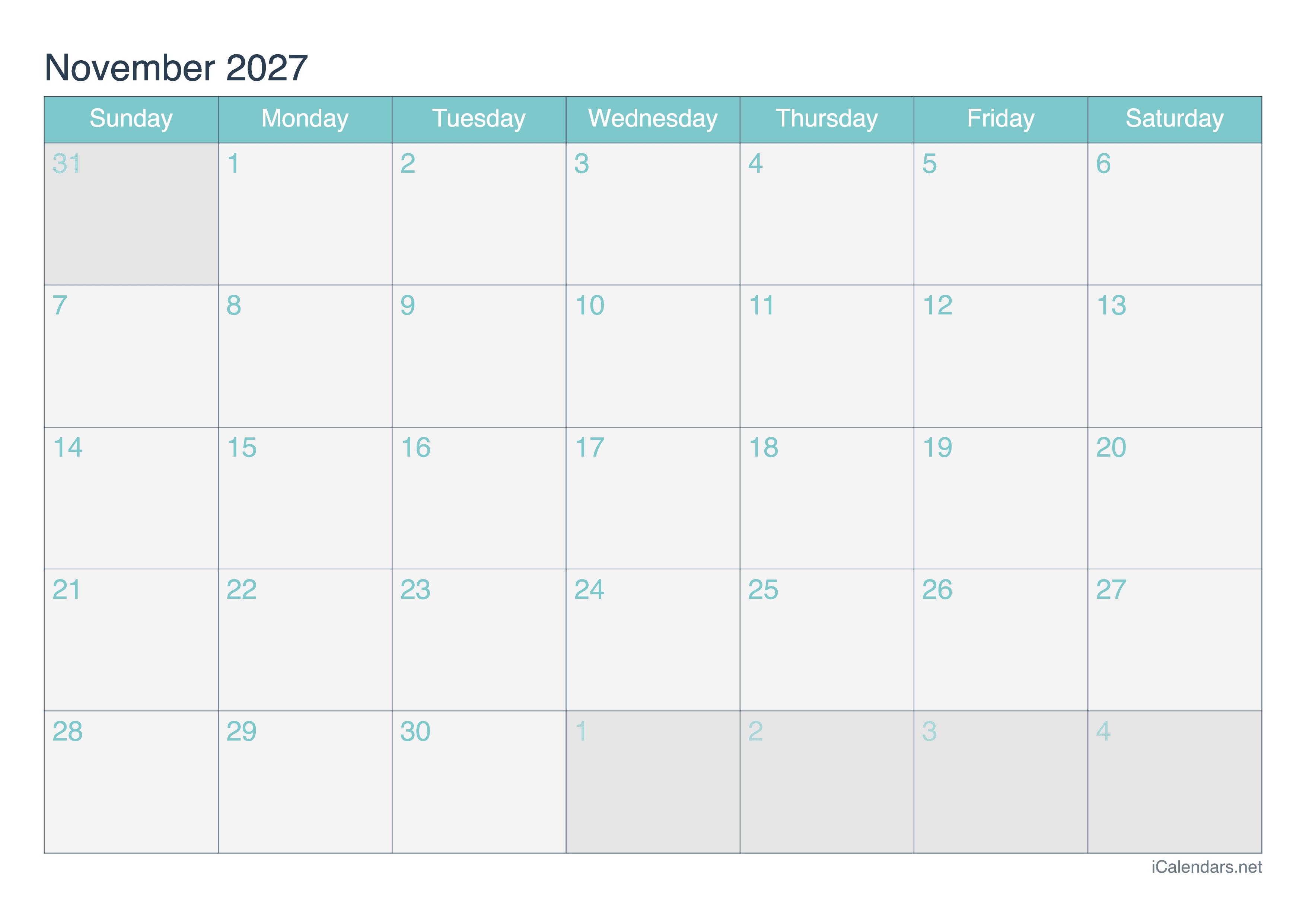 You can download and print this calendar of November 2027, available in image, PDF and Excel format. You can choose one of the 4 color themes.