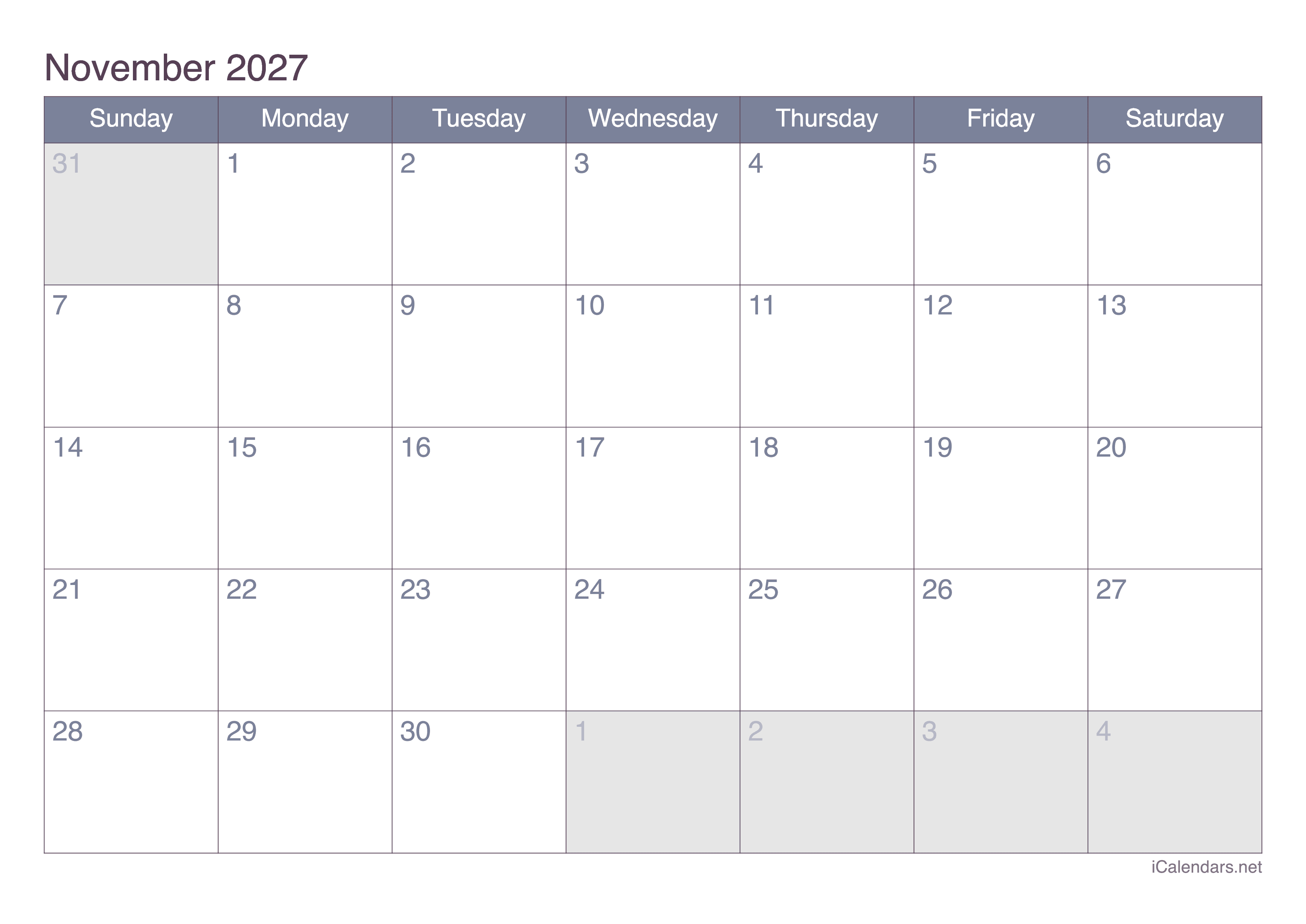 Printable Calendar of November 2027