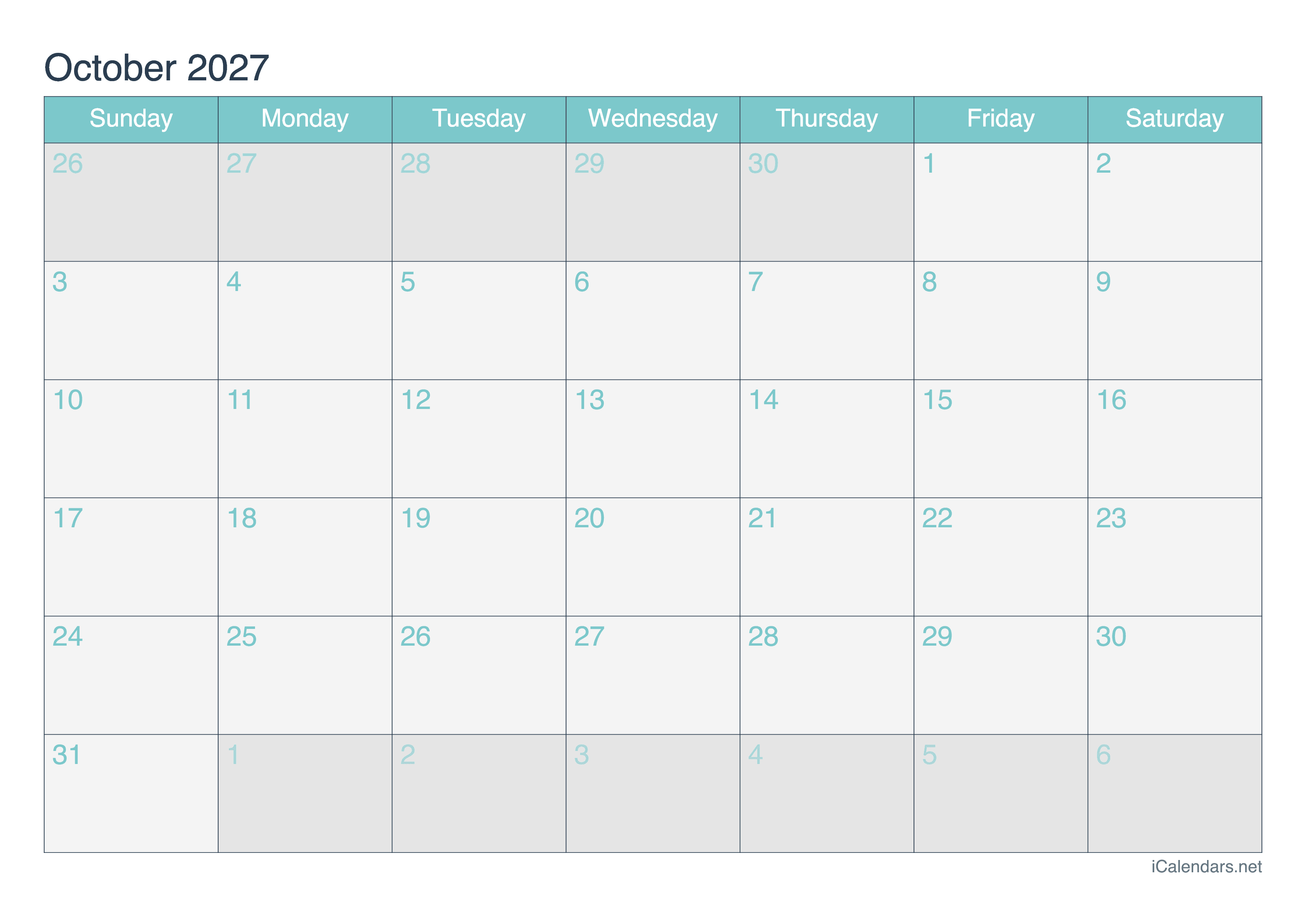 You can download and print this calendar of October 2027, available in image, PDF and Excel format. You can choose one of the 4 color themes.